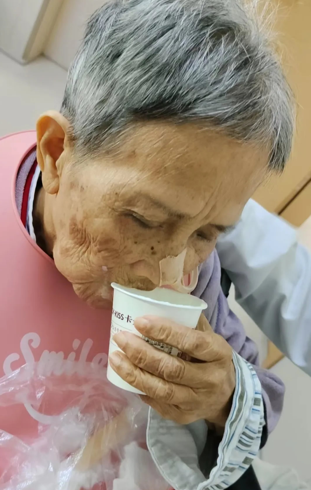 渐渐的,林奶奶开始能够尝试吞咽少量糊状食物,尽管过程艰难,但每一次成功吞咽,都让她眼中闪烁起希望的光芒。终于迎来医嘱拔除胃管的这一天,我们都很为奶奶高兴慢慢喝水。