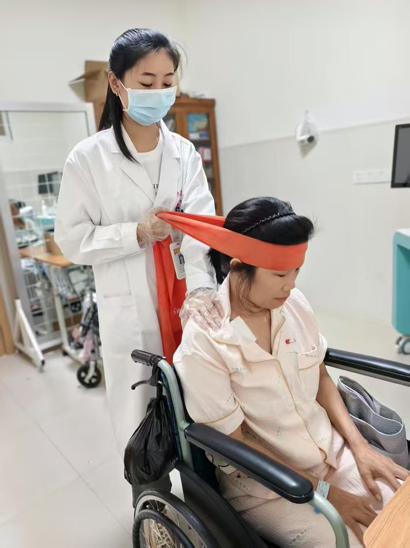 在安护康医院,康复训练每日有序进行。康复师带领许女士进行各项训练,从口腔肌肉活动,到吞咽神经刺激,再到吞咽动作练习,每一步都认真且坚定。