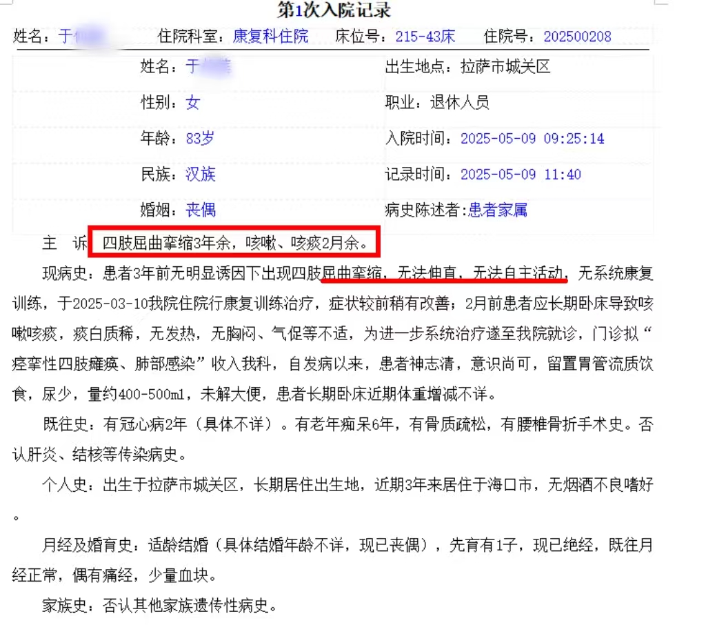 于奶奶被送进安护康时,身体状况让人揪心:双手因肌肉紧绷死死攥成拳状,怎么也无法自然舒展,双腿像被无形的线捆着般蜷缩在床,骨质疏松更是让她稍一挪动就疼得直抽气。更让人焦灼的是,她意识像蒙着层厚重的雾,想喝水、想翻身,都只能发出含混的咿呀声,连最基本的需求都没法说清。家人远在西藏也放心