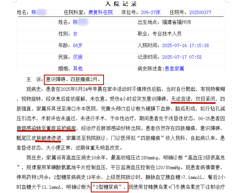 陈奶奶,一位 86 岁的老人,因在家中不慎摔伤后脑,引发硬膜下血肿、脑疝,还伴有肺部感染、四肢瘫痪等状况,生命一度垂危。由于身体状况复杂,手术风险极高,家人曾陷入深深的无奈,考虑过放弃治疗,选择临终关怀送入了我们安护康医院。